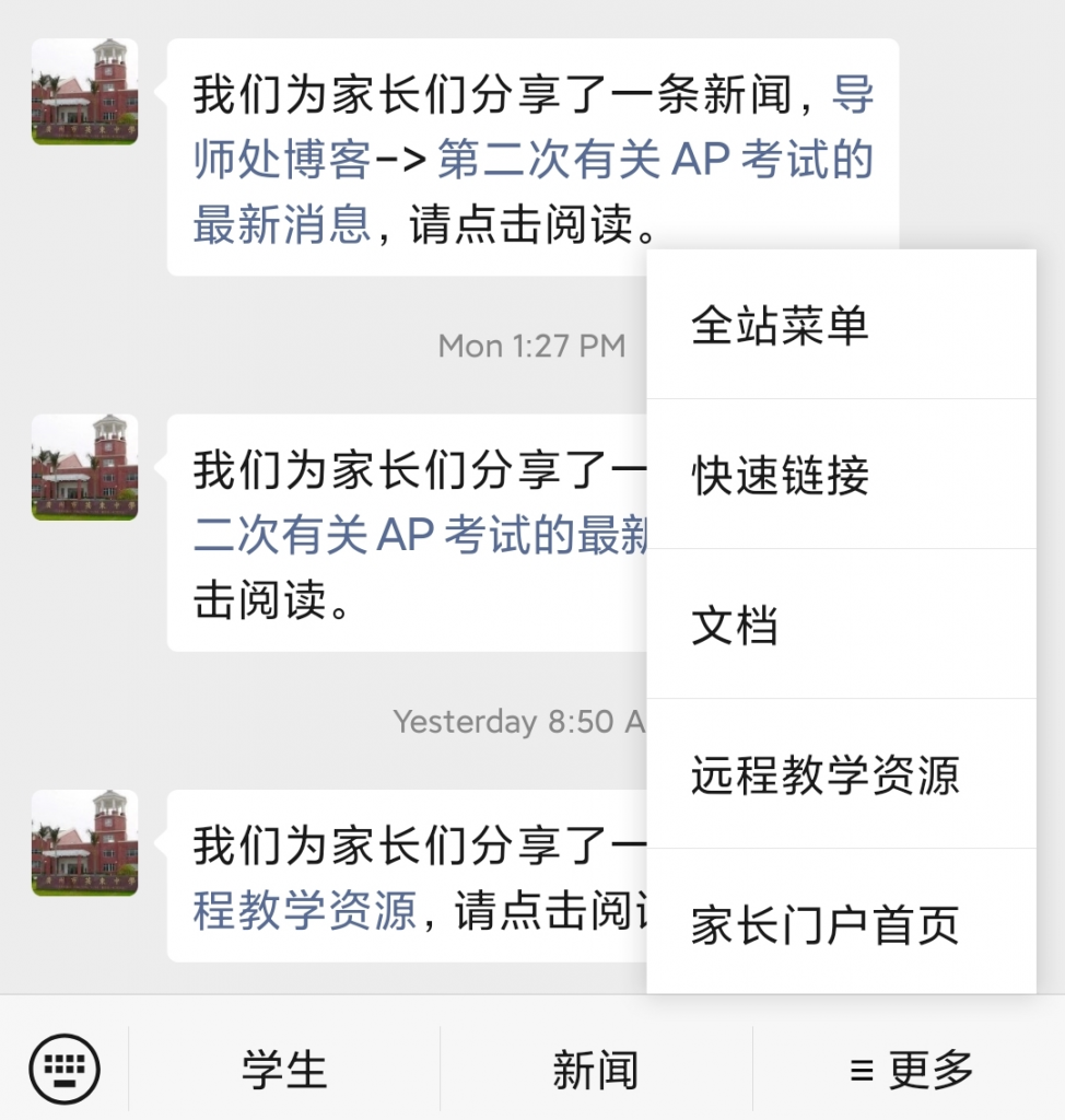 - 家长门户首页 – parent portal home page, same as 新闻 button