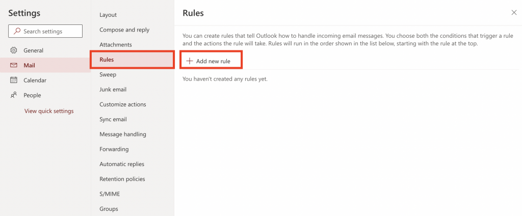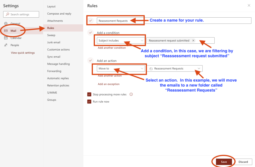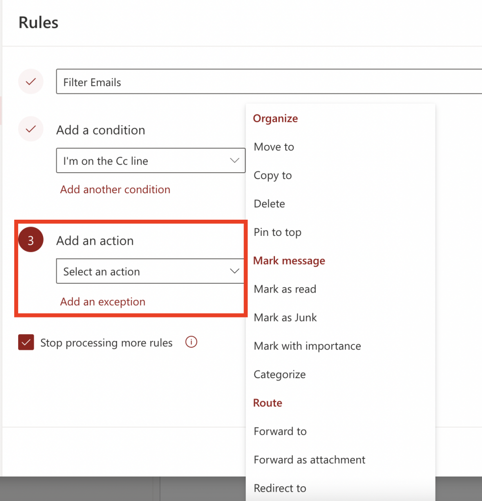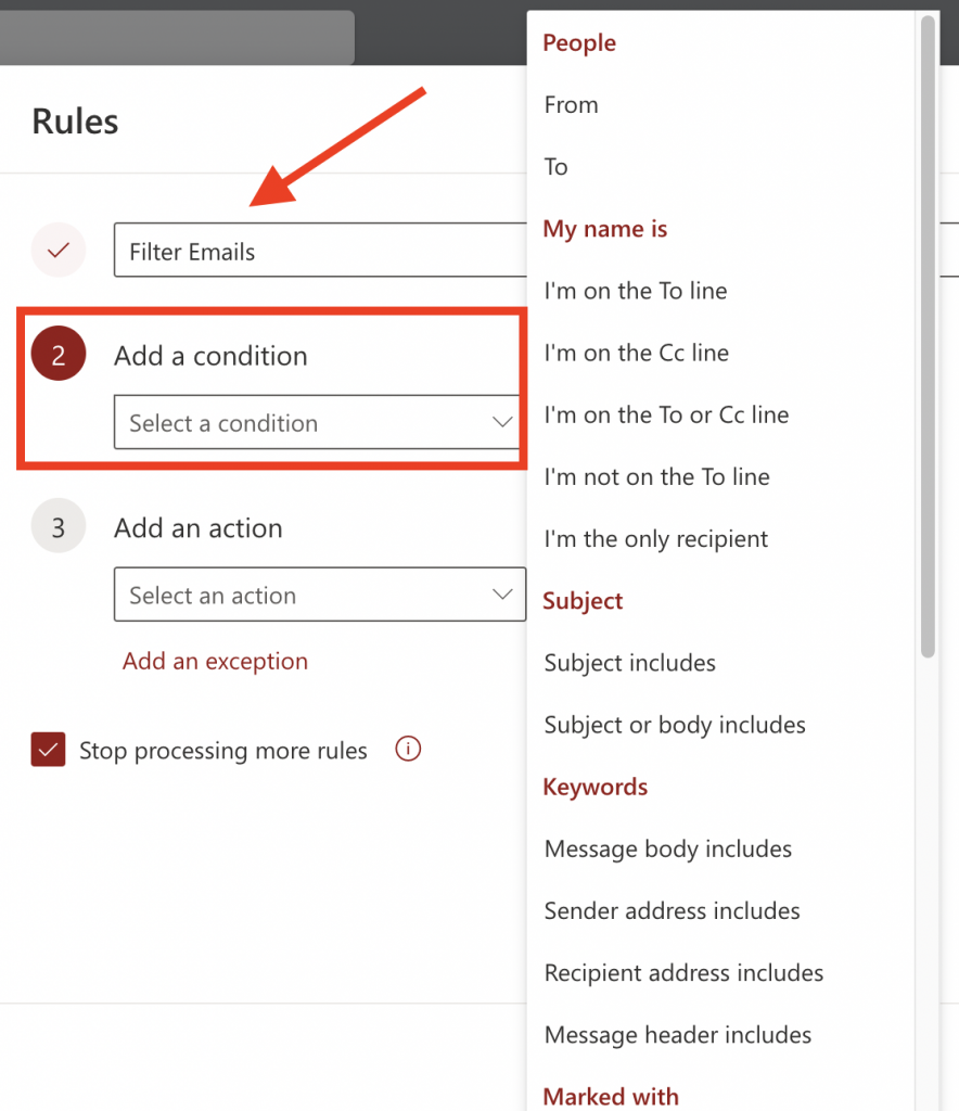 Create a name for the “rule” you want to set up. Then “Select a condition” that you want the rule to follow. You can select multiple conditions.