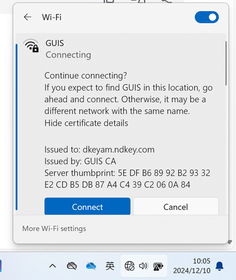 If you find that the certificate fingerprint provided when connecting to Wi-Fi is not as the same as below, do not enter any information and disconnect immediately.