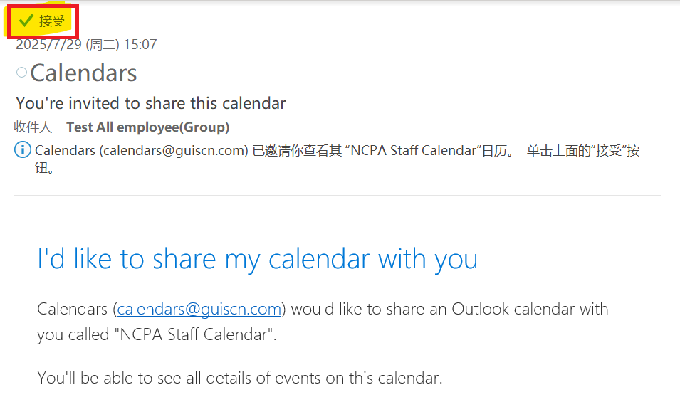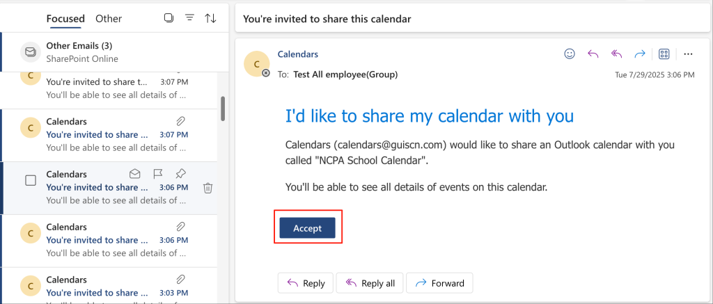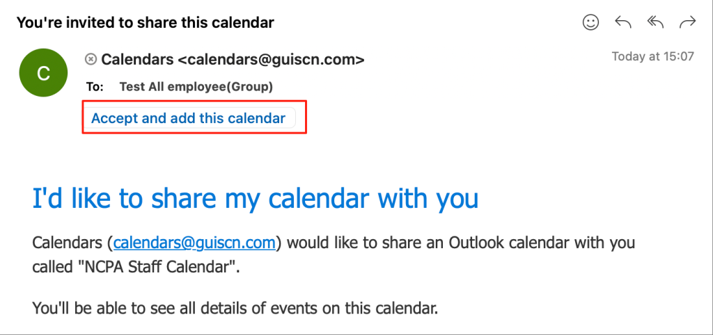 If you are using desktop outlook(mac or windows), it will take several minutes to sync the calendars after you click the Accept button. At the same time, the screen should be a little different with above screenshots.