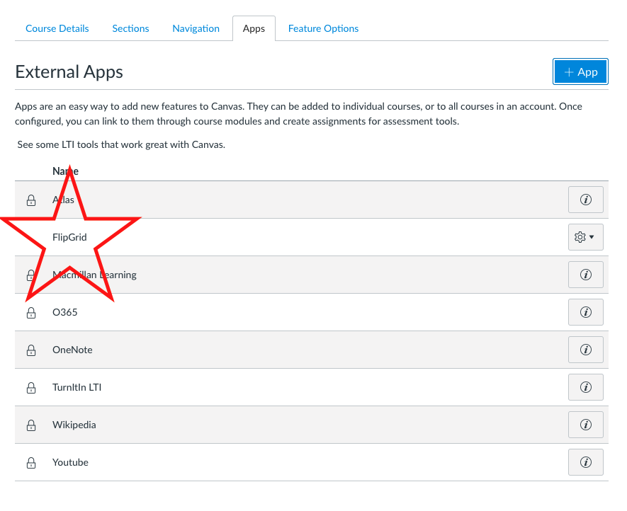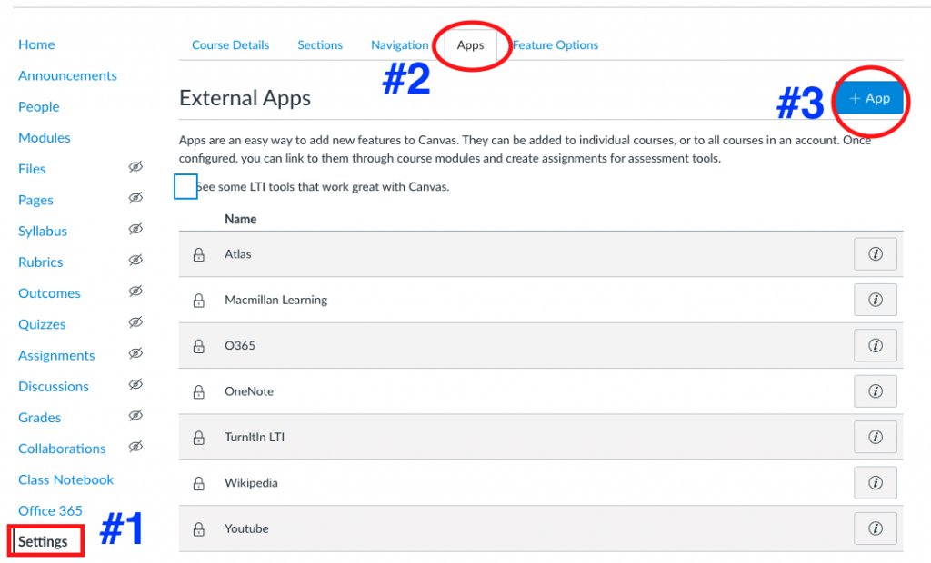 3. Open a course in Canvas that you would like to integrate with Flipgrid. Go to Settings –> Apps –> +APP