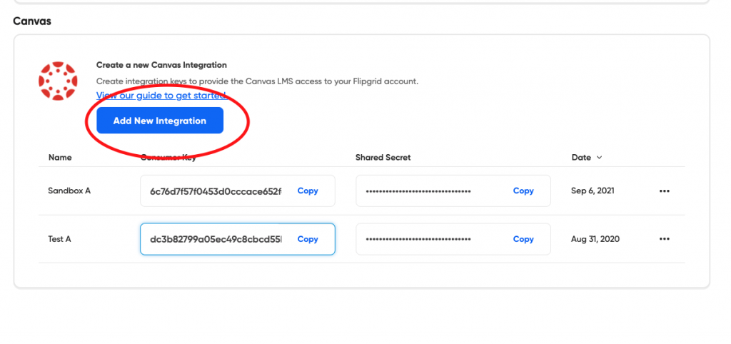 2. Scroll down and Select “Add New Integration”. It will generate a line with a consumer and shared secret key as in the example below. I recommend doing this for each different course you choose.