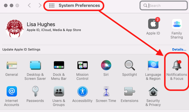 Lastly – check the settings on your MacBook by opening System Preferences–> Notifications & Focus