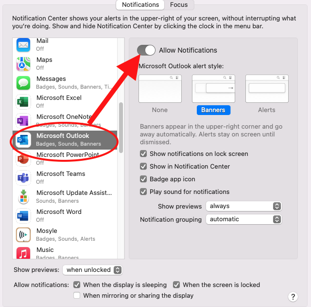 Find Microsoft Outlook — Turn the slider off or on to allow notifications such as banners or alerts.