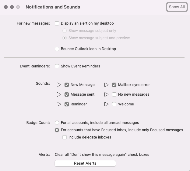 2. Outlook App – when the app is open, go to Outlook–> Preferences –> Notifications & Sounds