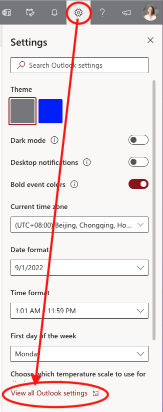 Outlook Web – start by going to the “Gear” icon in Outlook mail or calendar and select “View all Outlook settings”