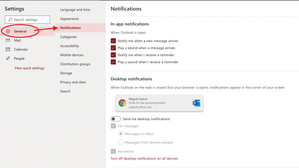 In the example, all In-app notifications are selected and all desktop notifications are turned off. This user will hear sounds and notifications when new emails arrive and for upcoming events from Outlook Calendar.