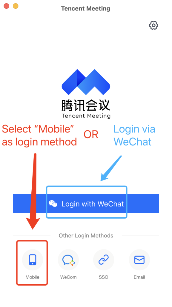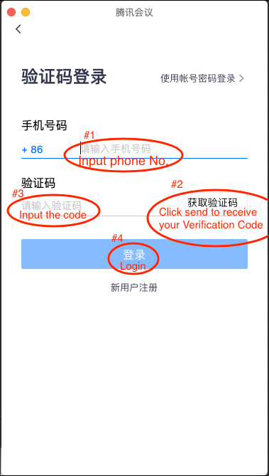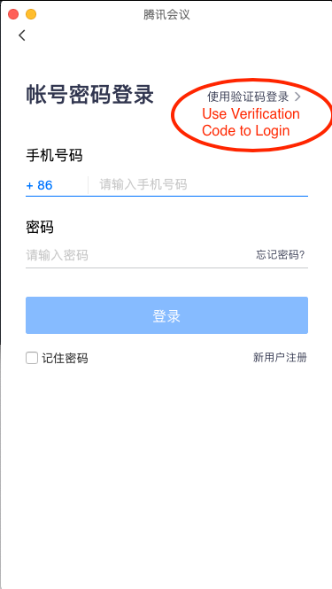 Use the verification Code method if you don't have a Tencent Meeting account before选择使用验证码登录方式如果你之前没有腾讯会议账户
