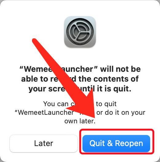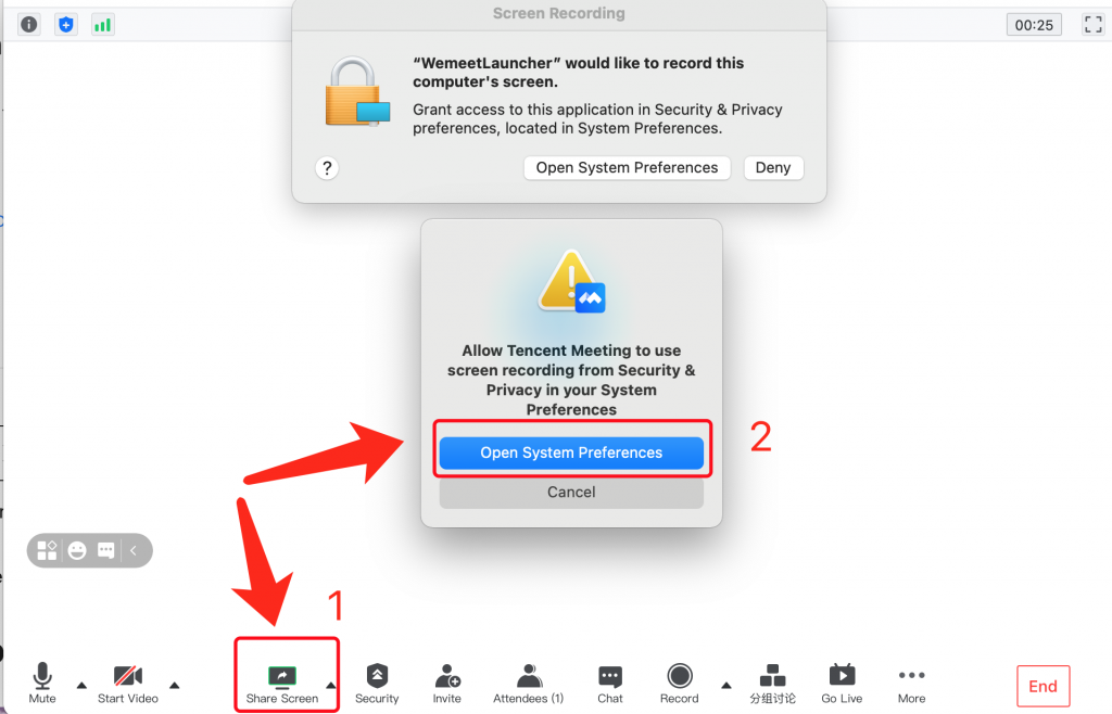 In the test meeting, click share screen, than open system preference to grant the screen record permission在测试会议中点击分享屏幕,然后打开系统偏好设置去允许屏幕录制授权