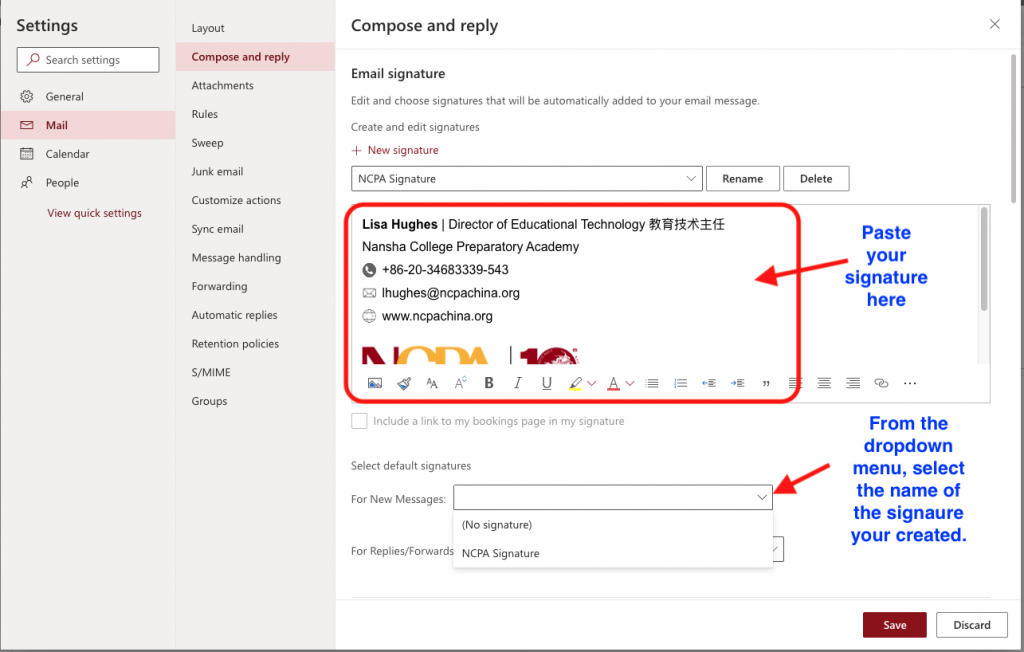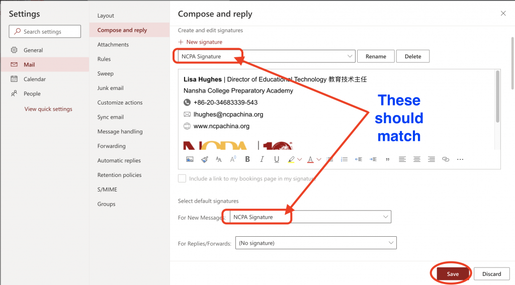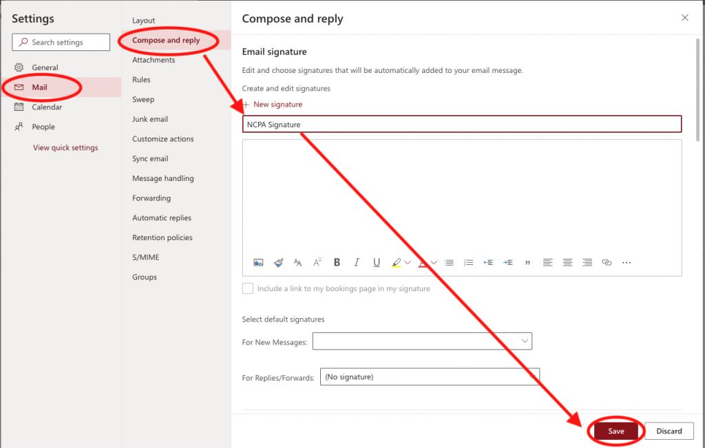 4. In Mail Settings –> Compose and Reply. In the box that says “Edit signature name”, create a name for your signature. For Example, “NCPA Signature”. Then click “Save”