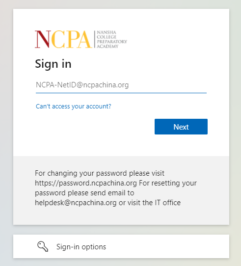 The timesheet is part of Office 365. When you visit the timesheet you will be prompted to log in to Office 365 if you aren’t already logged in. At the screen below, the “XXX” username field is your NetID username. You need to append “@ncpachina.org” when you log in.