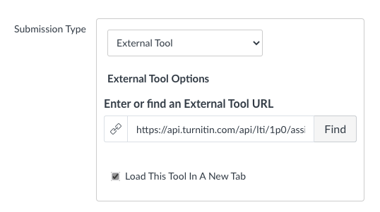 Under “Submission Type” select External Tool, Find Turnitin LTI, and check the box that says “Load This Tool In A New Tab” (See image below).