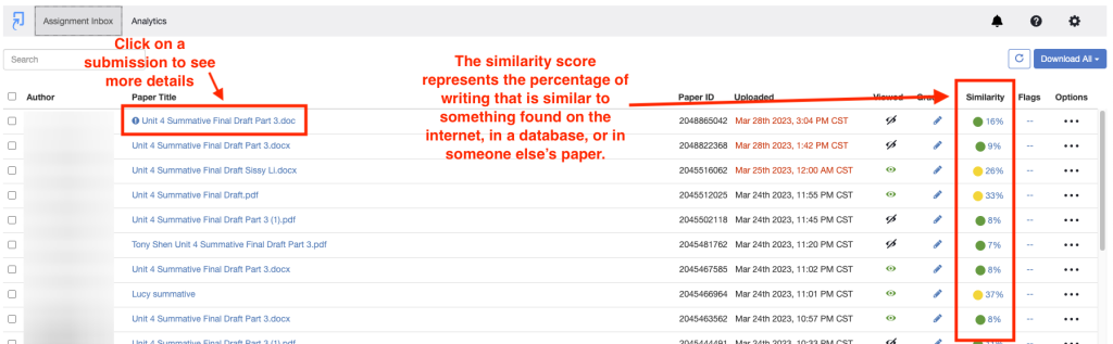After at least one student has submitted work, you can access their paper which includes a similarity percentage and details. Click the button that appears at the bottom of the assignment that says “Load + assignment + in a new window”. In the new window, you can see a list of all of the submissions.