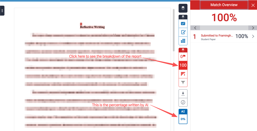 To see a break down of the similarity report, select a student submission. You can also check the percentage of writing that is written by AI.