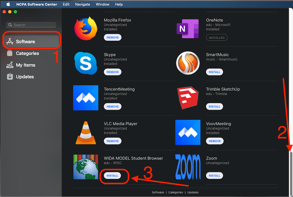3. NCPA Software Center -> Software -> scroll down to the button to find the app icon -> click INSTALL near WIDA MODEL Student Browser, it will start download the app