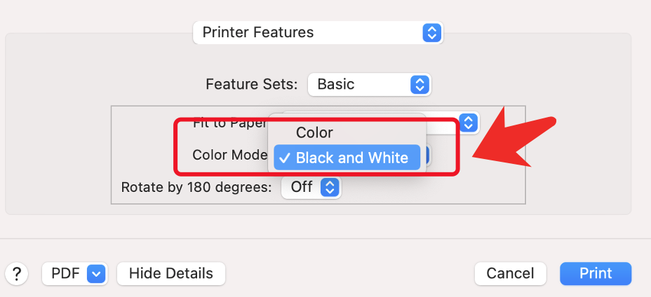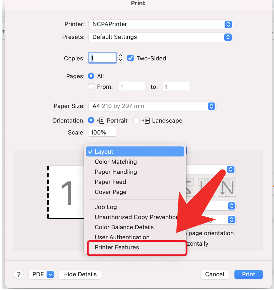 In the popup dialog select “show details” then “printing feature“ #