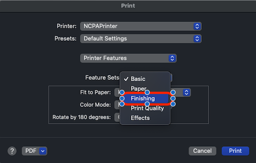 2. Find and select Printer Features from Copies & Pages drop down list