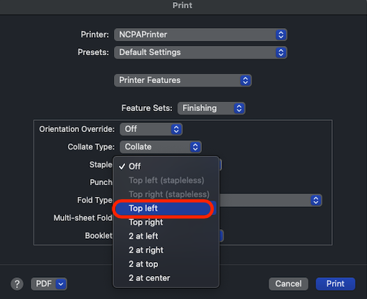 4. Select Top left from Staple