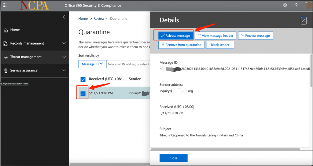 A. Choose messages to Release by your own by reviewing summaries every 3-day, see emails from quarantine@messaging.microsoft.com (messages not from microsoft.com are fake, please report to helpdesk@ncpachina.org)